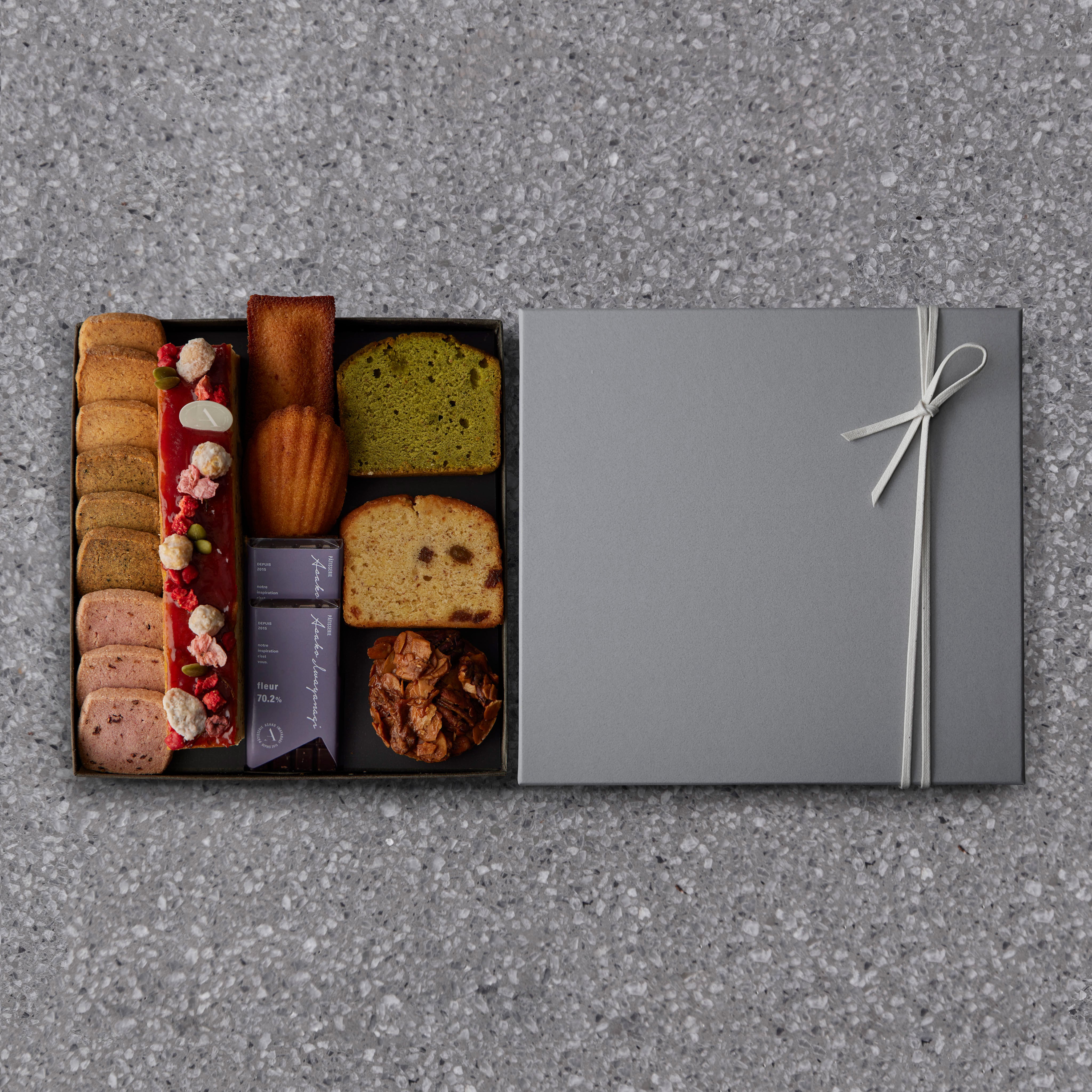 桜餡と桜の塩漬けを生地に焼き込んだしっとりタイプのパウンドケーキ。桜の花をトッピングし、春らしい桜の花道を表現しました。