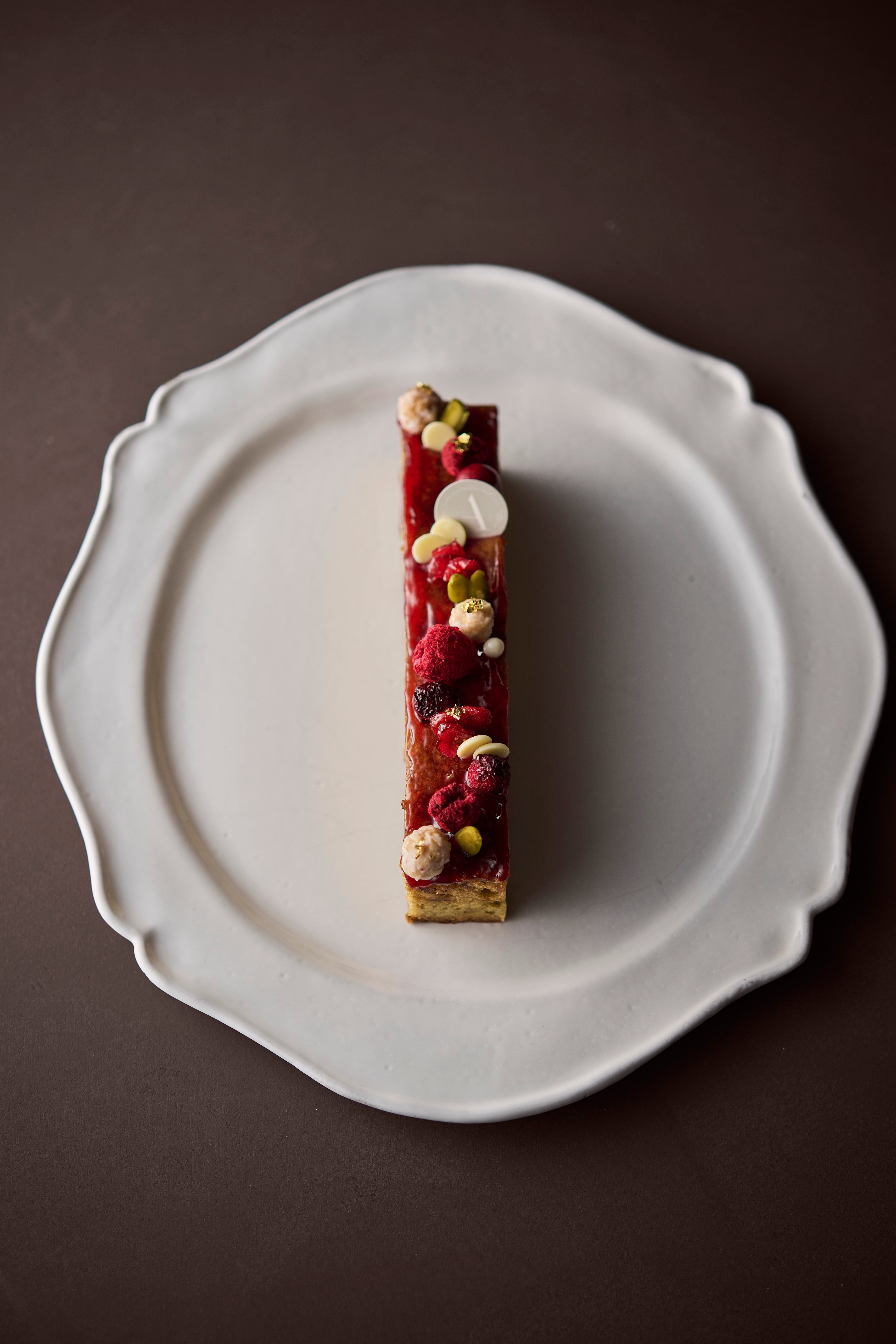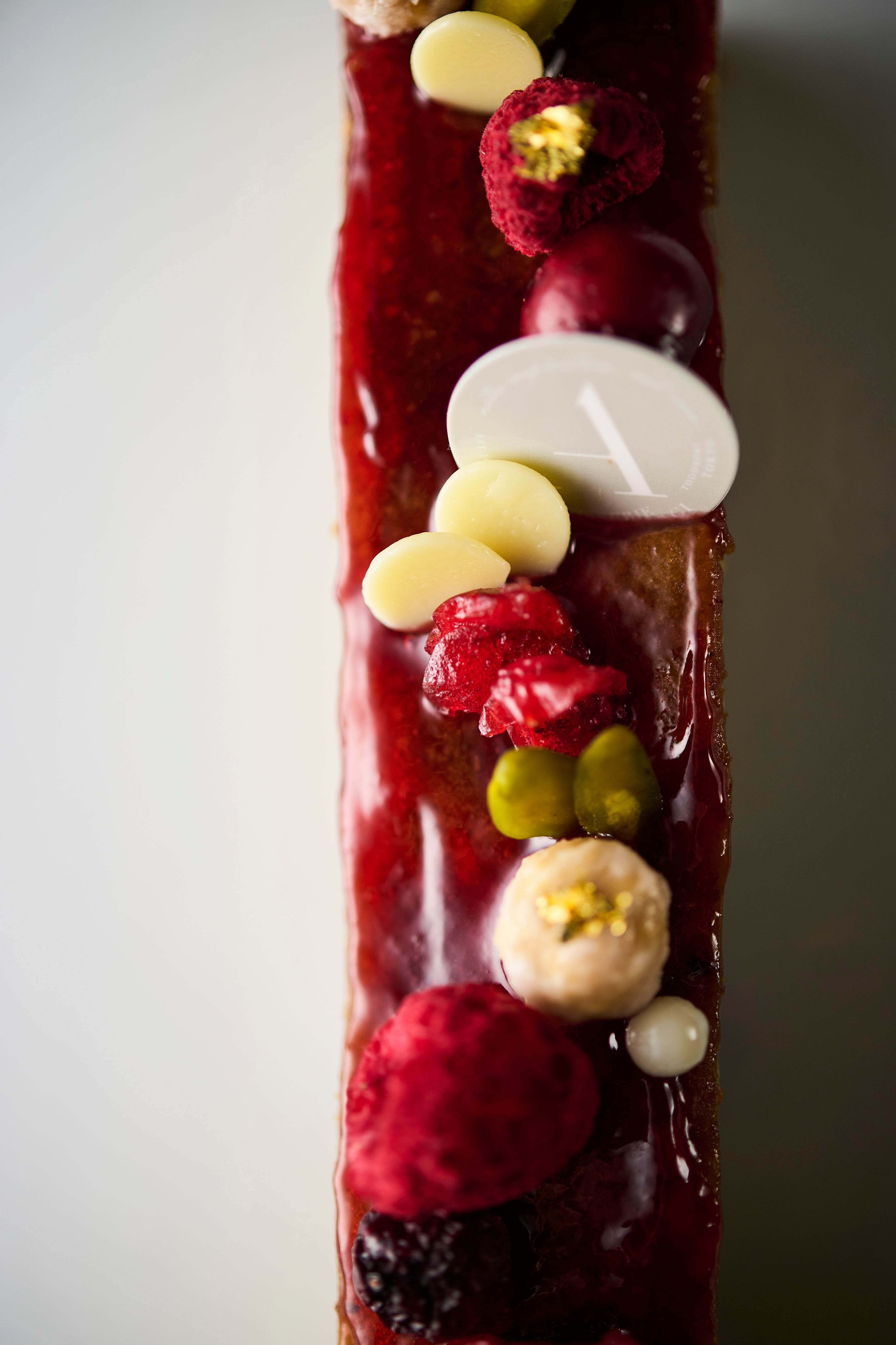 グリオットコンポートとピスタチオを焼き込んだパウンド生地にラズベリージャムを塗り、フリーズドライのベリーをトッピングしました。上品に散りばめた金粉が華やかに演出します。