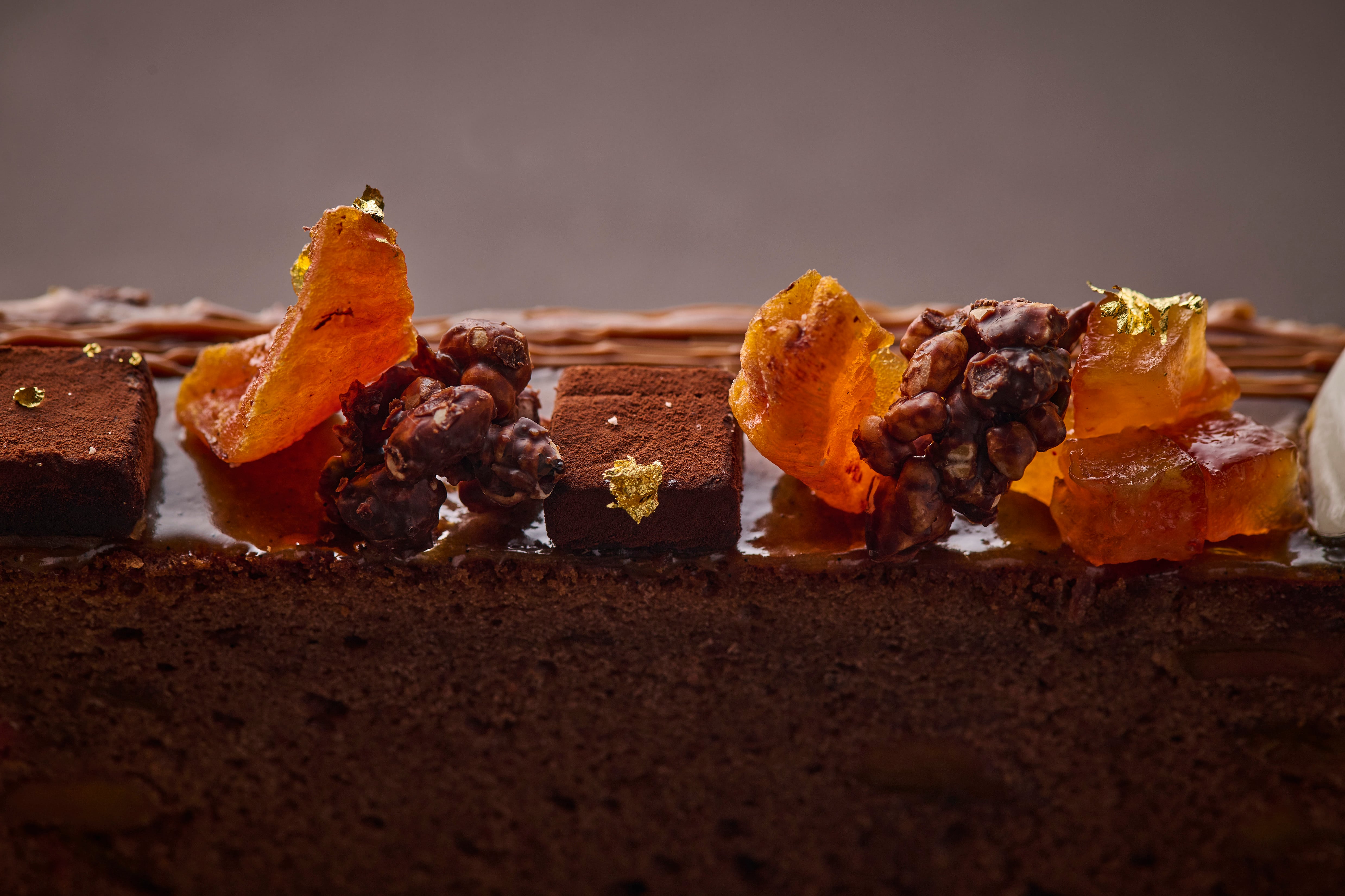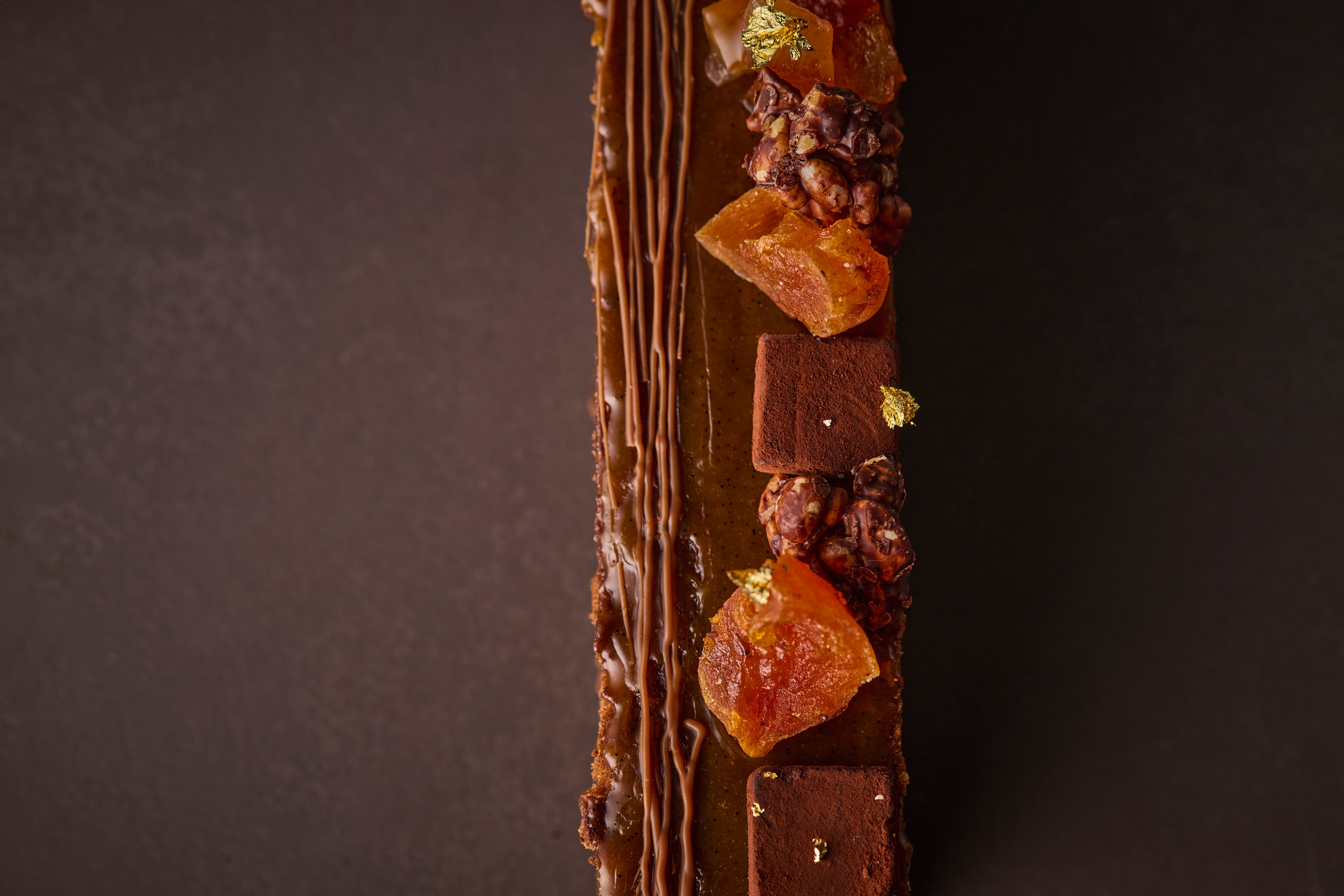 スパイスで漬け込んだ干し柿を焼き込み、しっとりと仕上げた生地に、生チョコを重ねました。