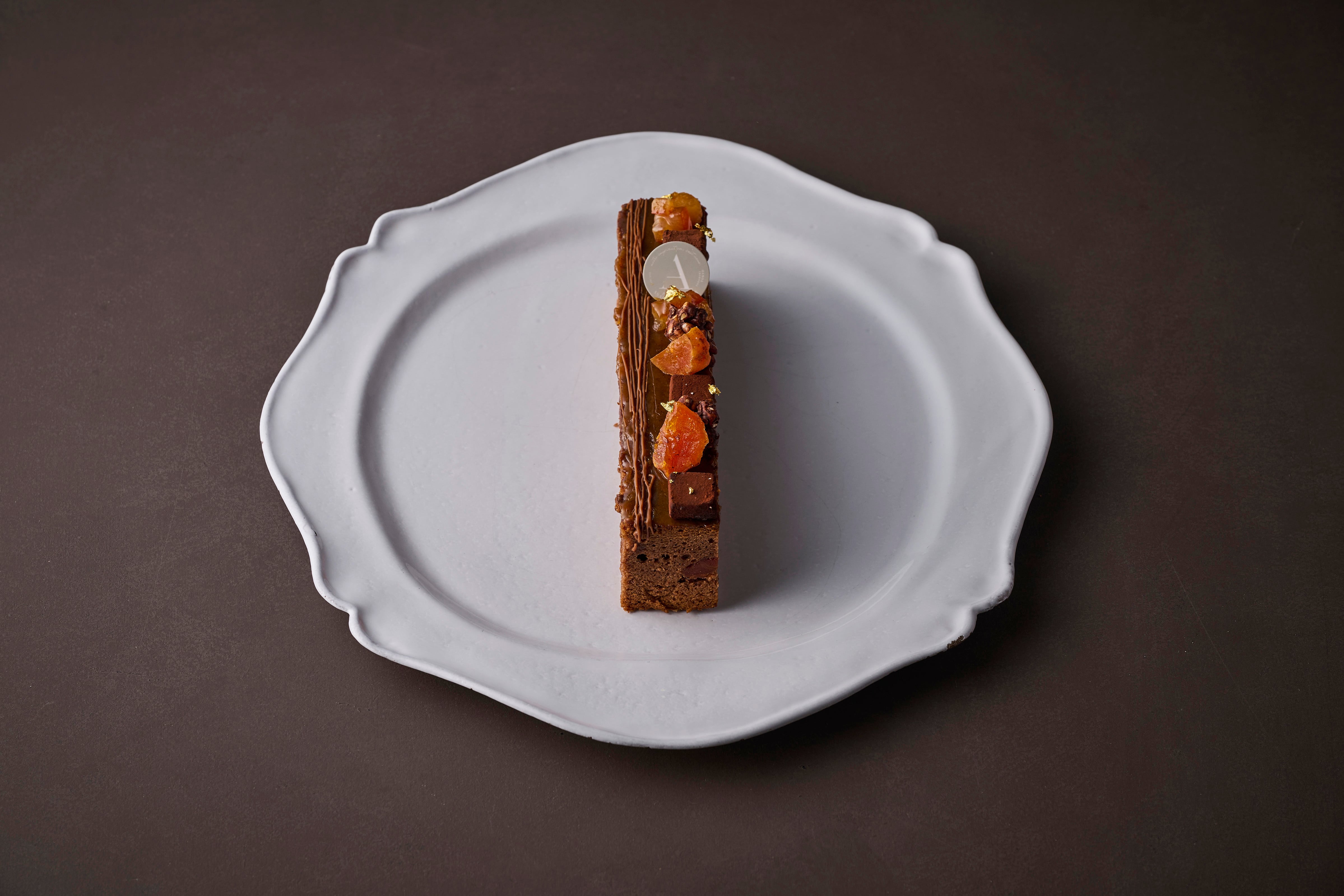 スパイスで漬け込んだ干し柿を焼き込み、しっとりと仕上げた生地に、生チョコを重ねました。