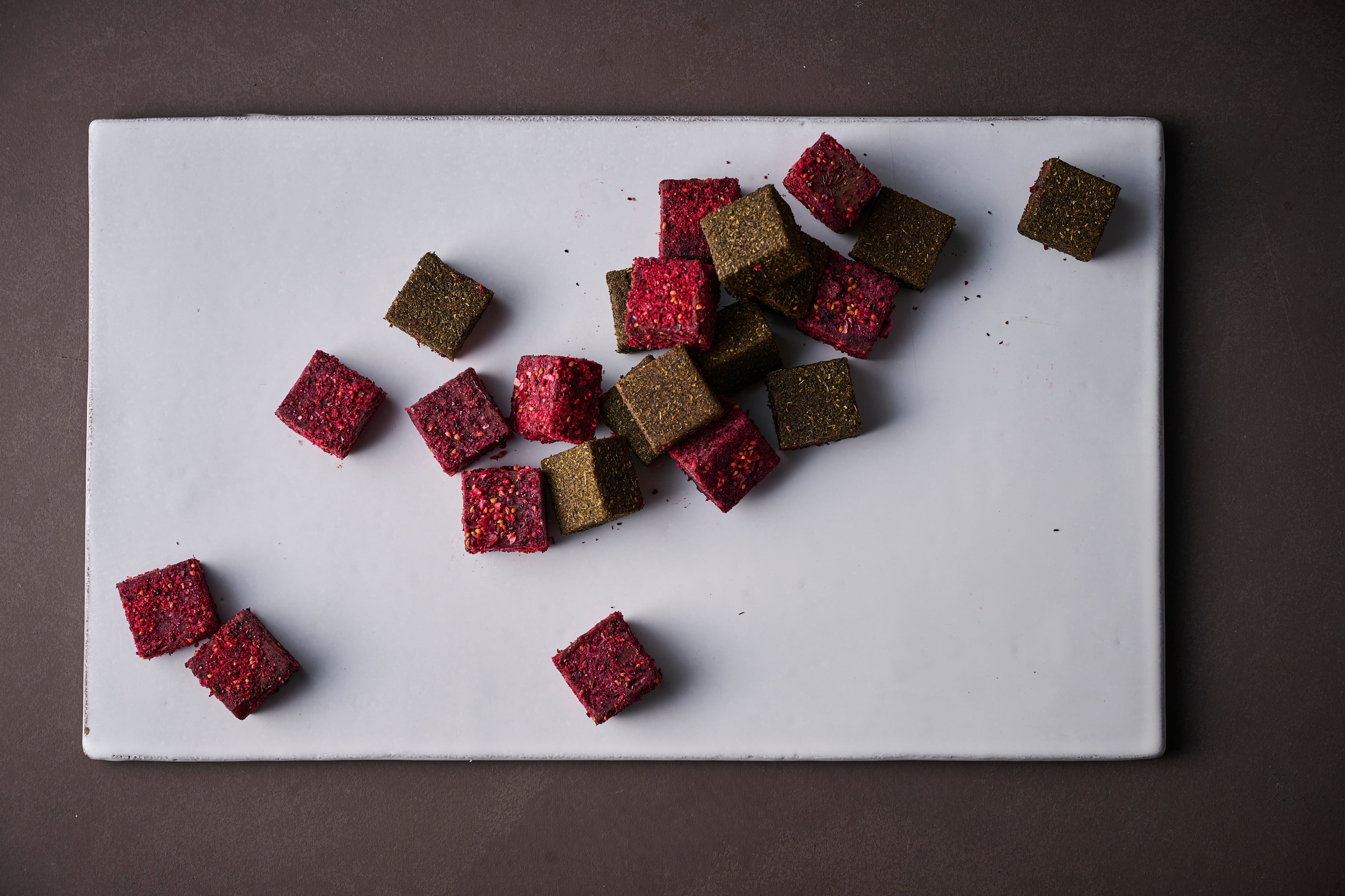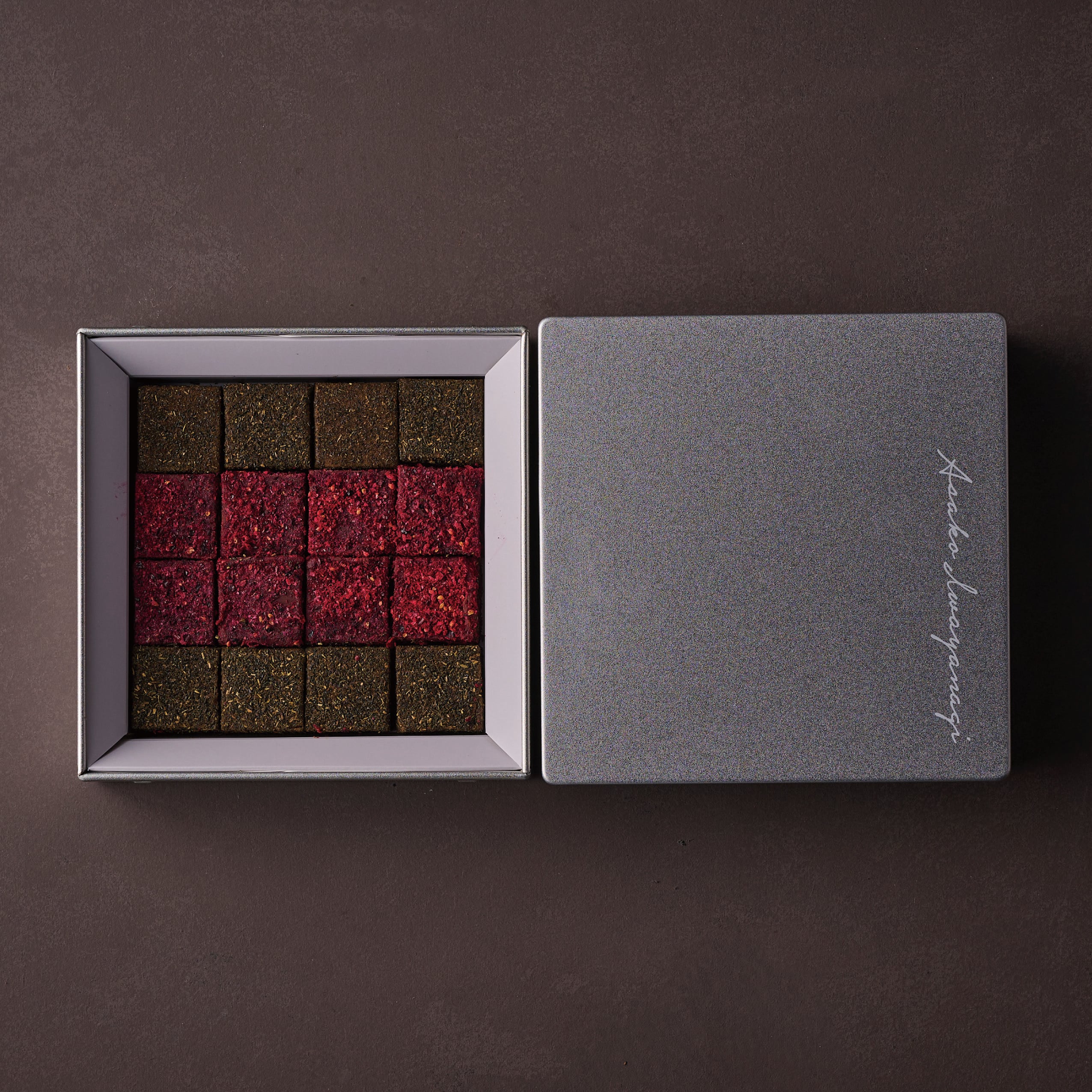 ライチローズフランボワーズと焙じ茶、2種のフレーバーを詰め合わせた今年の生チョコ。