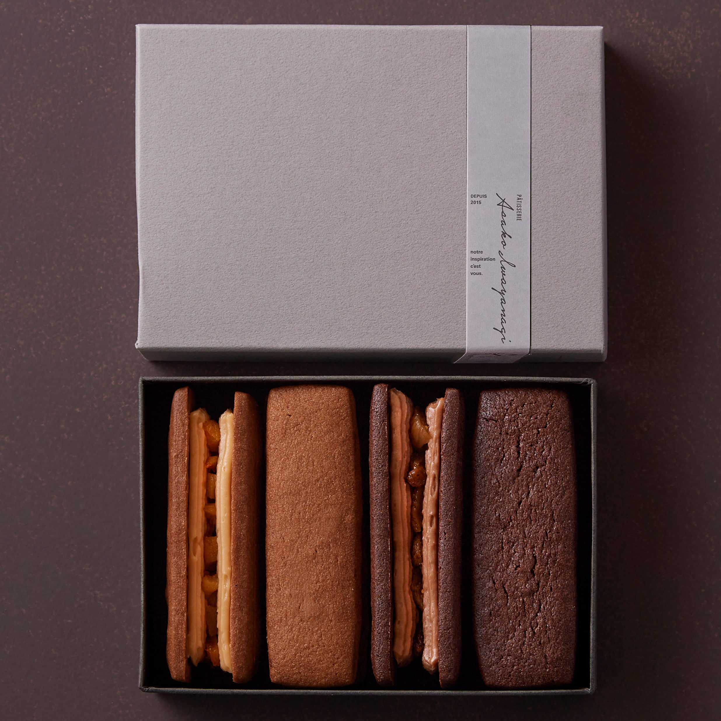 無花果とレーズン、アプリコットとオレンジをラム酒に漬け込み、ショコラバタークリームと共にショコラ生地でサンドしました。バレンタイン限定のバターサンド。