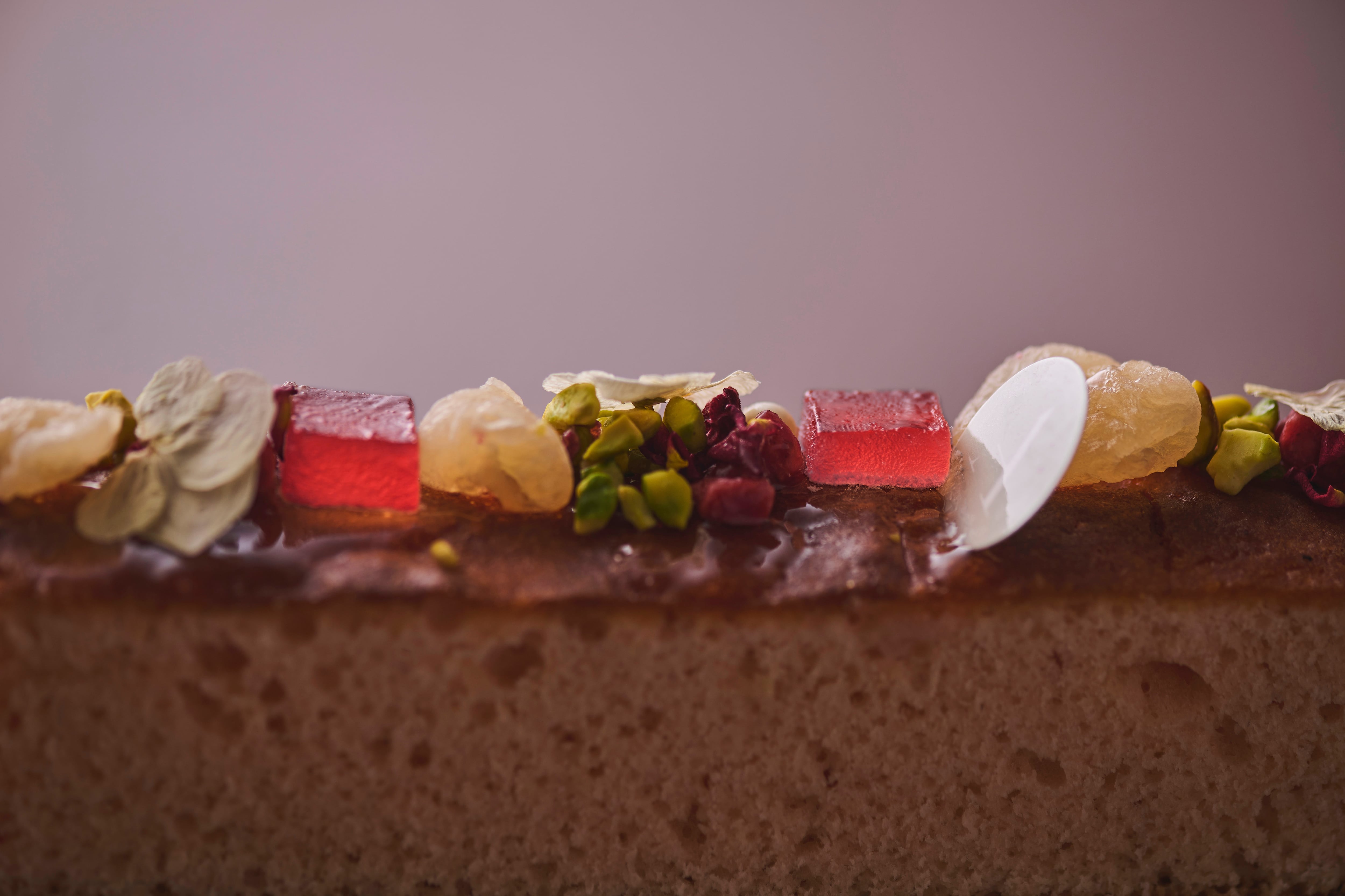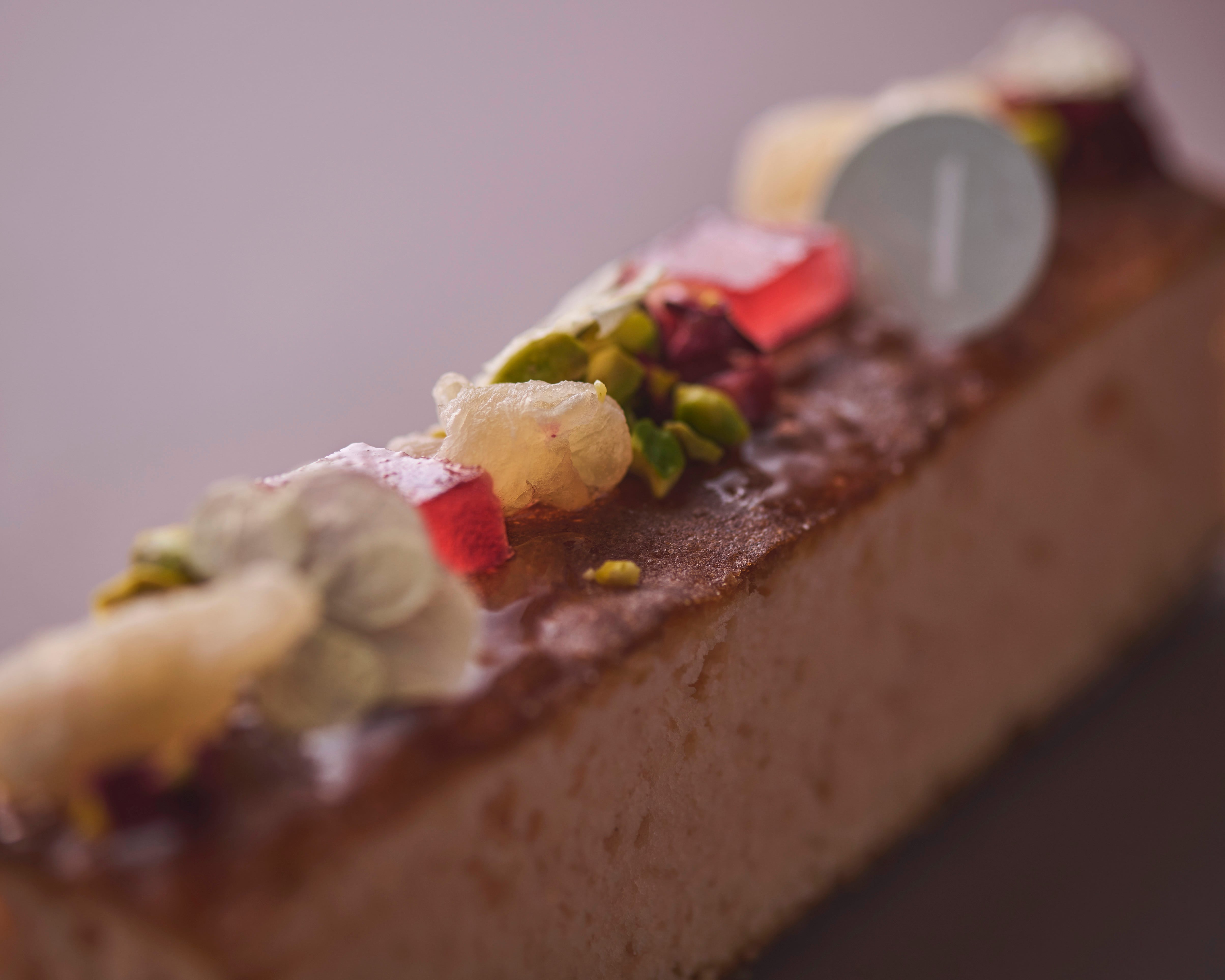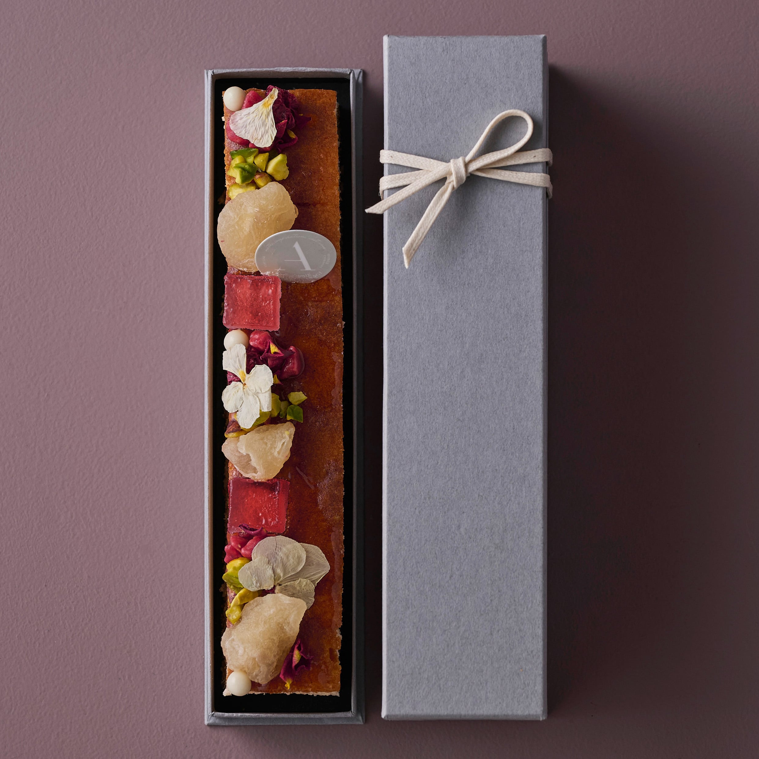 フランボワーズ、ライチ、ローズが香る、ふんわり軽やかなパウンド生地に、ライチを思わせる甘みのドライランブータンや、ライチフランボワーズのパートドフリュイを重ね、エディブルフラワーを添えて華やかに仕上げました。