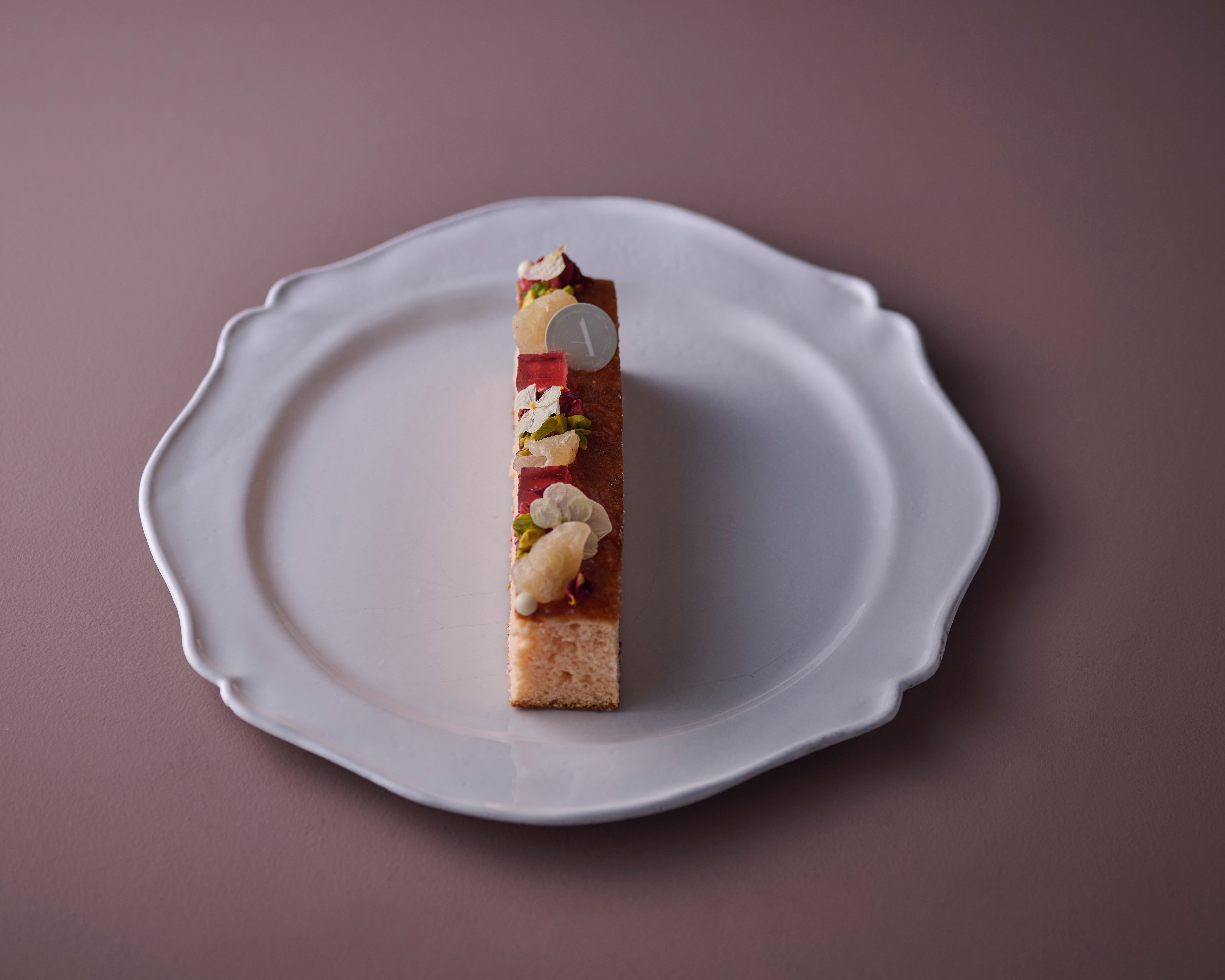 フランボワーズ、ライチ、ローズが香る、ふんわり軽やかなパウンド生地に、ライチを思わせる甘みのドライランブータンや、ライチフランボワーズのパートドフリュイを重ね、エディブルフラワーを添えて華やかに仕上げました。