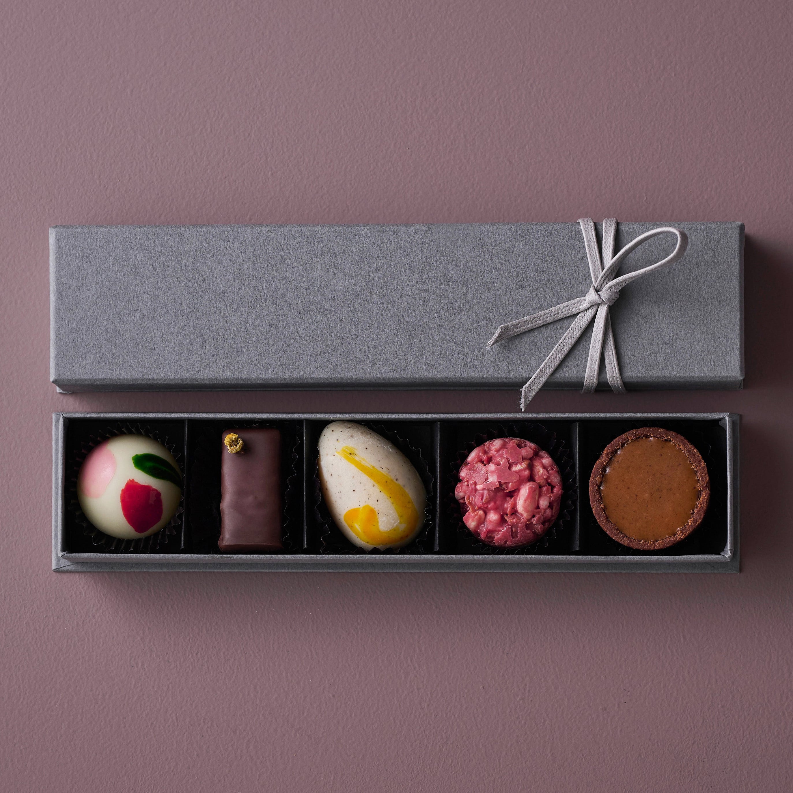 なめらかな口どけとカカオの豊かな風味に、ライチやカモミールなど香りの余韻を楽しめるフレーバーを揃えました。