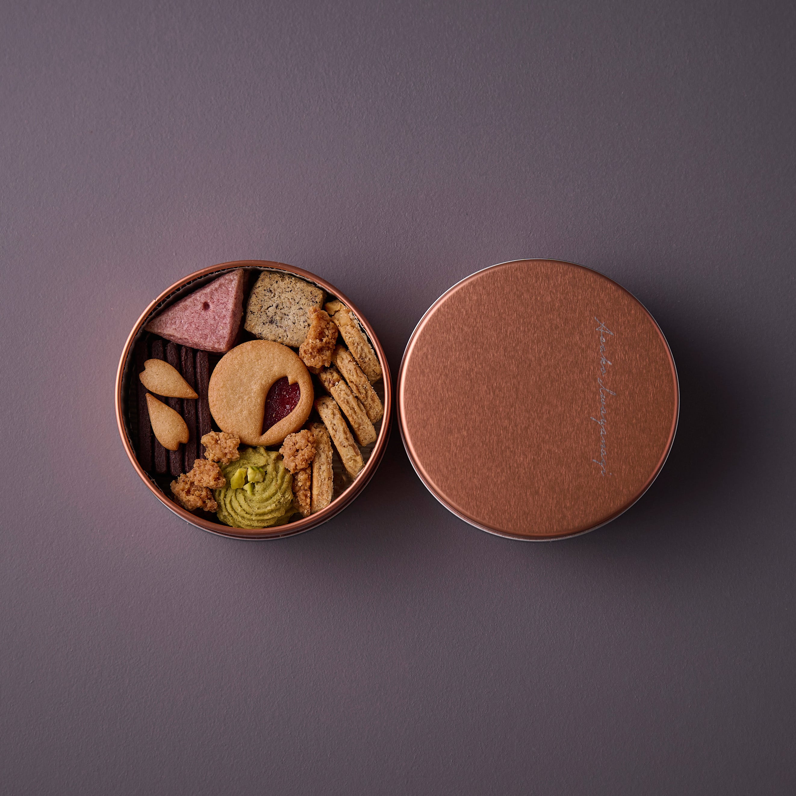 桜の花びらを散りばめたような春の吹寄缶。さくほろ食感のサブレや香 ばしいクッキーを少しずつ楽しめます。季節の彩りと共に「ありがとう」の 気持ちをお届けします。