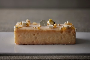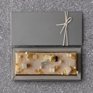 甘酸っぱいレレモンの香りとサワークリームを焼き込んだ、ガトーウィークエンド。レモンのグラスアローでデコレーション。白をモチーフに小花やホワイトチョコレートをデコレーションしました。