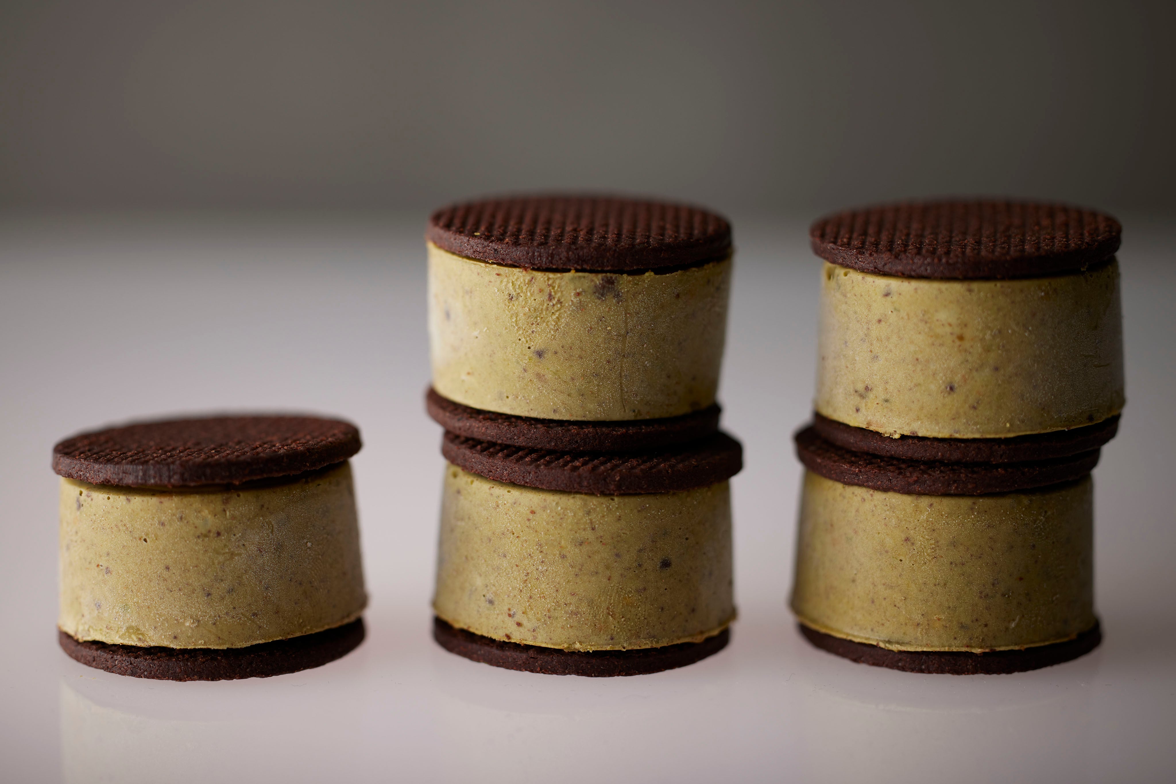 ピスタチオたっぷりの贅沢なリコッタチーズクリームにコーヒー豆やドライ苺を混ぜ込みショコラサブレでサンドしました。冷凍のそのままではもちろん、常温に数分置いてサブレがしっとりしたところで召し上がるのもおすすめです。それぞれの食感をお楽しみください。